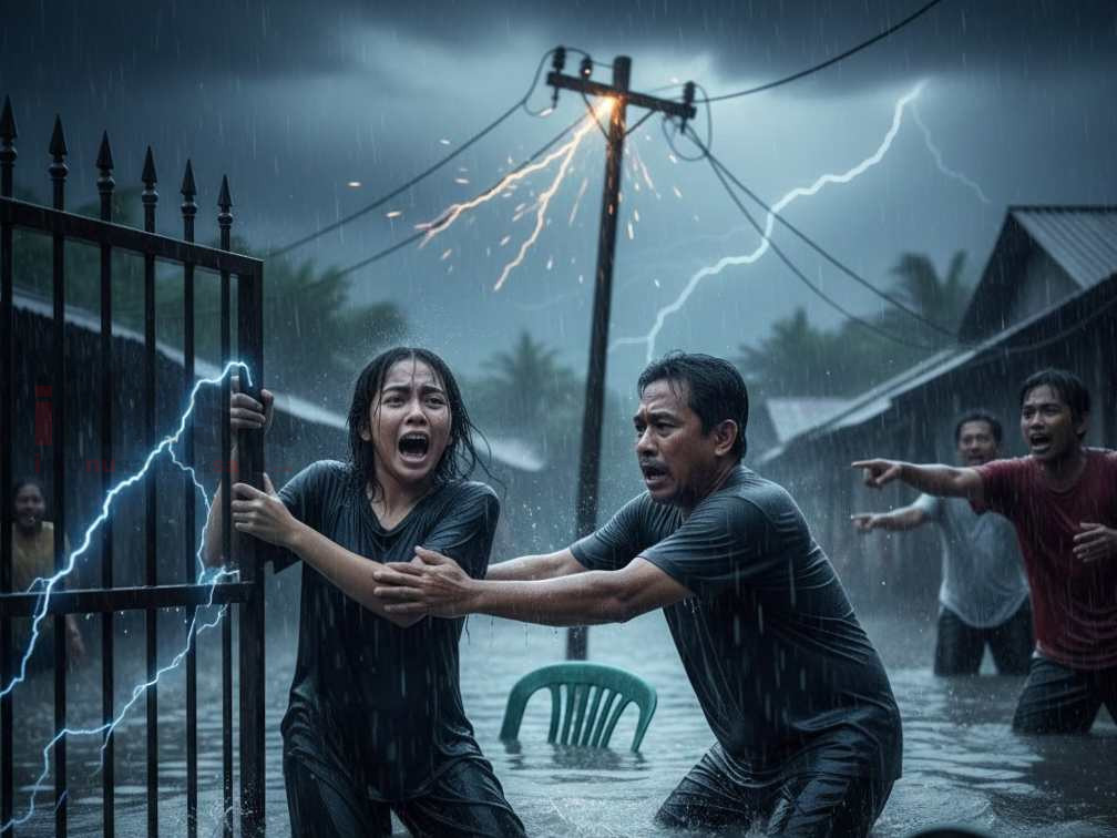 Tanpa disadari, pagar besi rumahnya telah teraliri arus listrik yang berasal dari jaringan instalasi yang terendam.