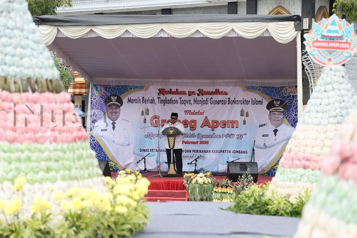 Bupati Jombang, Warsubi saat sambutan. (iNusa) JOMBANG – Pemerintah Kabupaten (Pemkab) Jombang melalui Dinas Ketahanan Pangan dan Perikanan menggelar tradisi “Megengan” bertajuk Grebeg Apem di Alun-Alun Jombang, Kamis (12/2/2026) pagi. Acara ini diselenggarakan sebagai bentuk pelestarian budaya sekaligus simbol kesiapan spiritual masyarakat Kota Santri dalam menyongsong bulan suci Ramadan 1447 H.